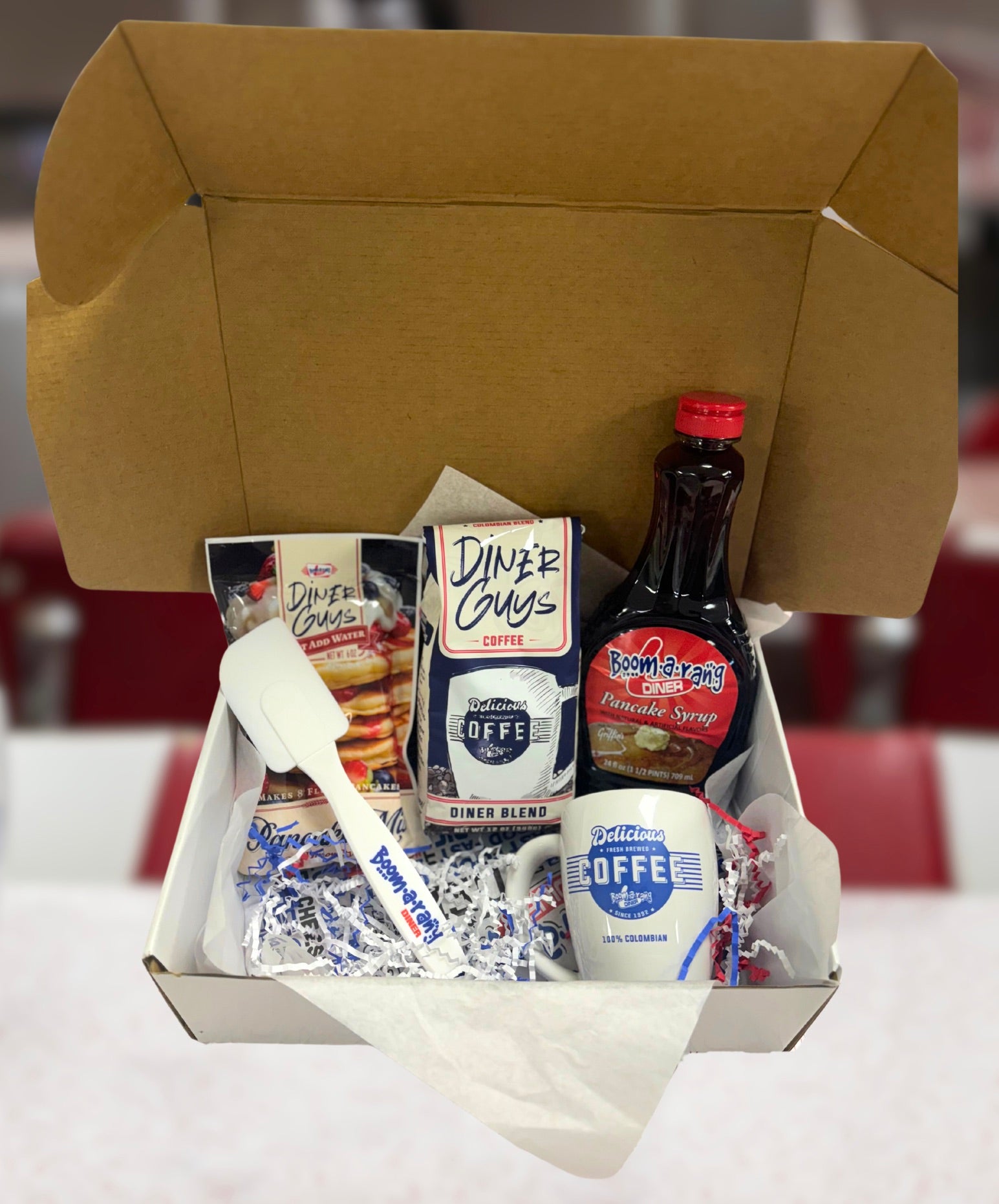 Give the gift of a perfect morning with our Boomarang Breakfast Gift Box! This thoughtfully curated package includes a bag of our Diner Guys Coffee, guaranteed to bring a smile to any coffee lover’s face. Pair it with our Boomarang Syrup and fluffy Boomarang Pancake Mix for a breakfast that feels like a warm hug. To complete the set, we’ve included a handy baking spatula and a Boomarang Diner mug, perfect for sipping coffee while flipping pancakes. It’s the ideal gift for anyone who loves starting their day with a delicious breakfast—even if that someone is you!
